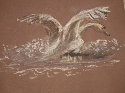 Looking at swans ( as I will have a swan within my film)..I decided I wanted to have a drawn image. ...I have been working on swan sketches ...tried pencil...charcoal..pastel...and liked the pastel image best...I tried a variety of techniques and material but pastel seems to be the consistant material of choice for me. Going back to Kentridge and Dudock DeWit ...looking at their film work...and reading about their rationale and process..I am now sure this is the right choice. Even with figure sketches now I prefer the feel and look of pastel and have sourced some lovely pastel pencils which will also give me finer line and still allow for the charcoal technique ...rubbing out and drawing the next 'frame'.....at points if I decide to do this.